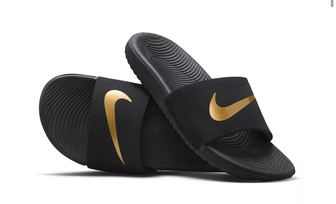 Last stock! Product form Nike Kawa Slide Black Metallic Gold GS $25.00 Size Size chart 5 6 Quantity Add to cart Guaranteed secure & safe checkout.